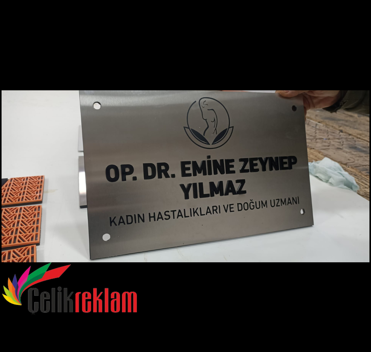 Fırçalı paslanmaz zemin üzerine lazer kesim yöntemiyle hazırlanan kabartma pleksi harfler sayesinde tabelanız hem estetik hem de dikkat çekici bir görünüm kazanır. Duvara mesafeli montaj sistemi sayesinde derinlik etkisi oluşturur ve bulunduğu ortama prestij katar.